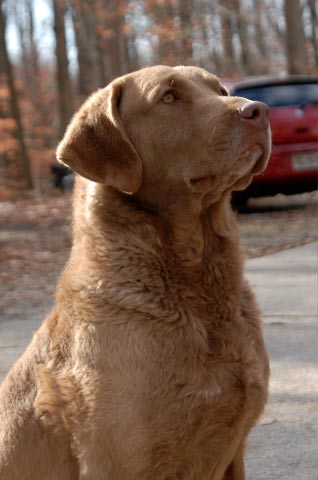The Chesapeake is a strong, muscular dog with a short, thick wavy coat. He comes in any shade of brown and has yellow or amber coloured eyes. Compared to the Labrador, he is slightly bigger in stature and has a very different personality.